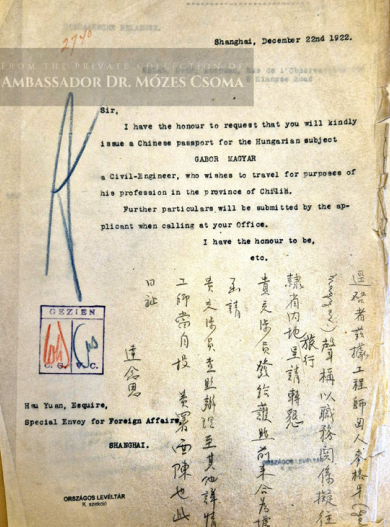 가장 중요한 발견은 1922년 상하이에서 발견된 문서였습니다. 네덜란드 영사관(당시 헝가리인의 이익을 대변)에서 발급한 중국 국내 여권 신청서에서 한 헝가리인의 이름을 발견할 수 있었습니다.